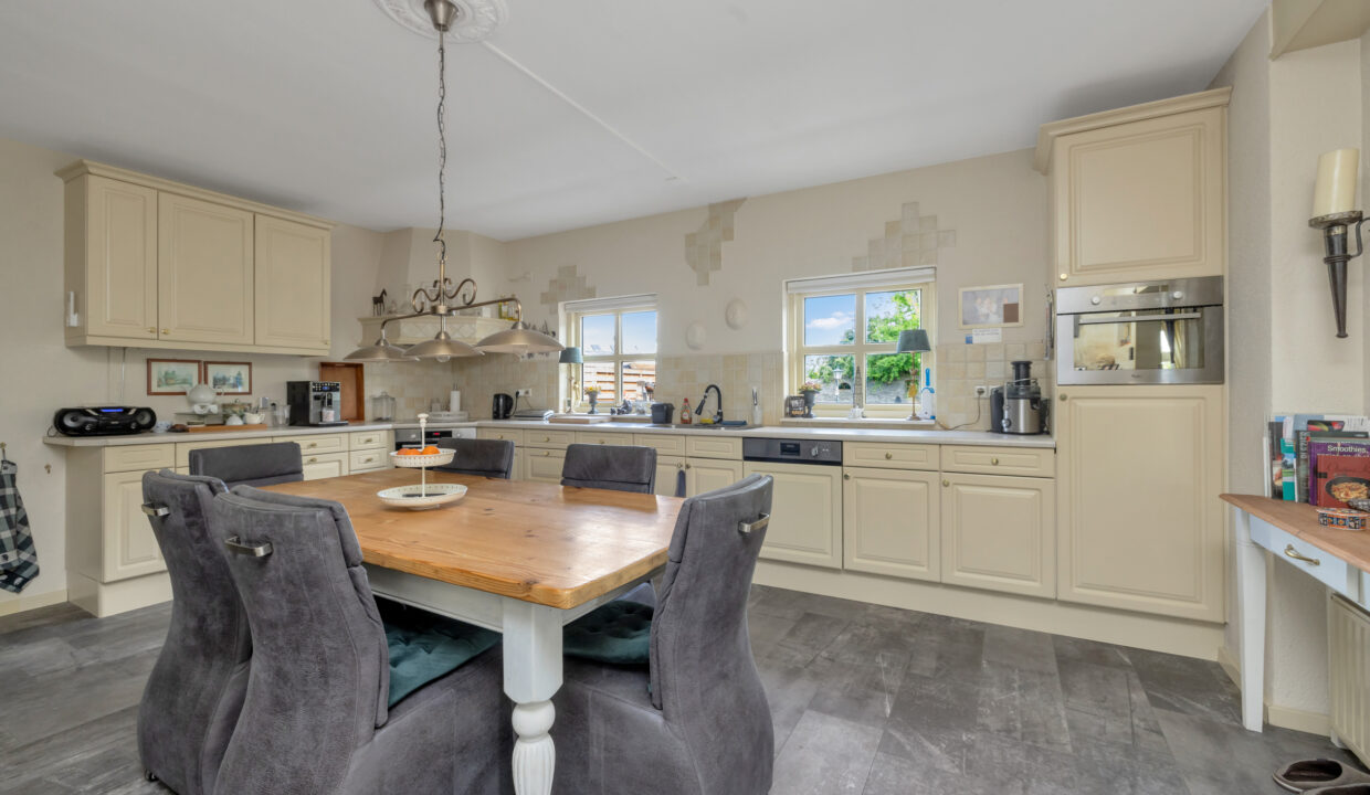 Via de voordeur kom je in een ruime hal met trap, meterkast en toilet. Rechts ligt de lichte woonkamer (ca. 38 m²) met grote ramen en ruimte voor een zit- en eethoek. Aansluitend vind je de open keuken (ca. 5,75 m breed) met dubbele spoelbakken en zicht op de tuin. De bijkeuken, met wasmachineaansluiting en extra bergruimte, grenst aan de keuken en garage. Vanuit hier bereik je de overkapping in de tuin.