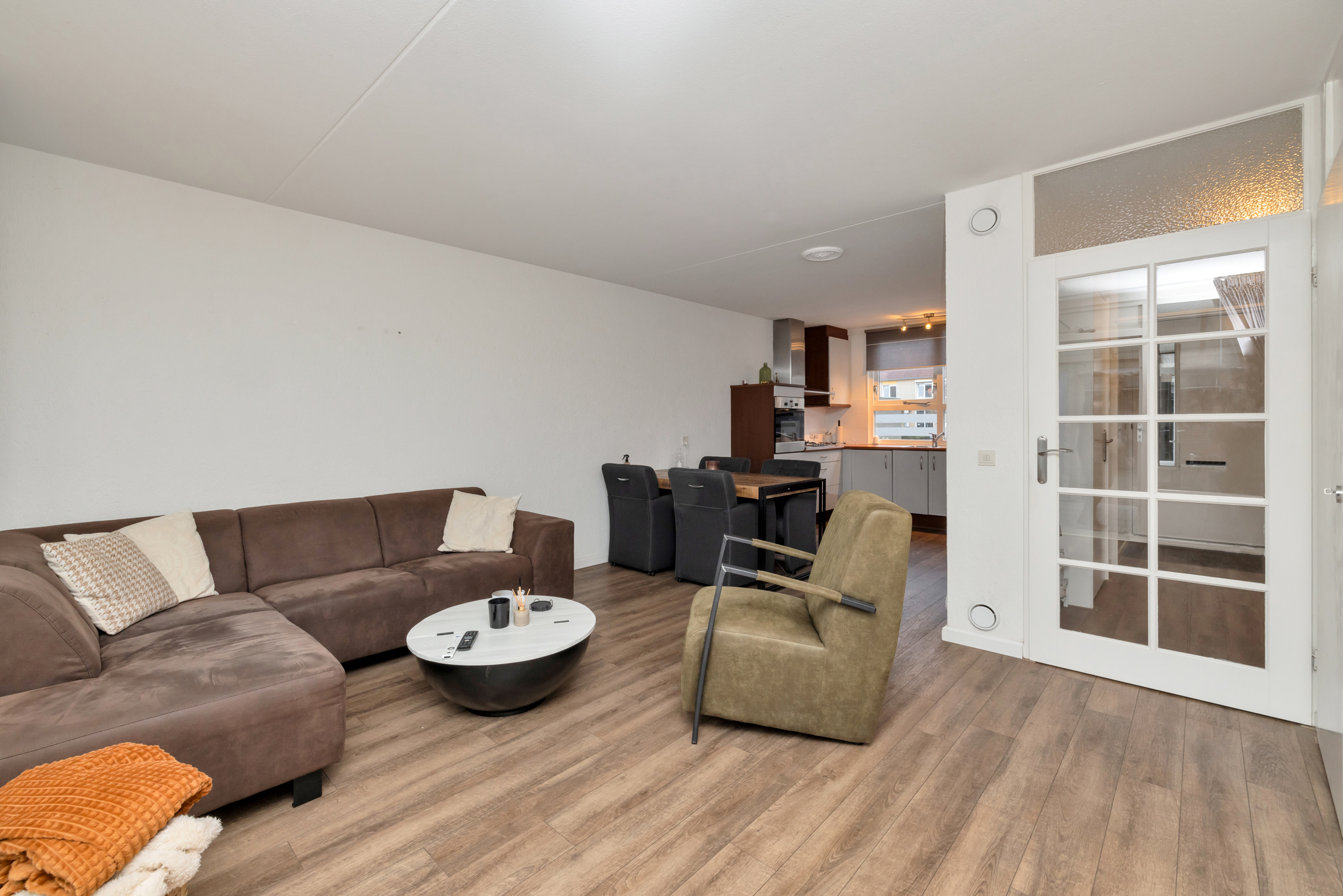 Via de entree aan de voorzijde kom je binnen in de hal met meterkast, toiletruimte en toegang tot de trapopgang. Vanuit de hal loop je door naar de ruime en lichte woonkamer, die dankzij de lengte van de woning prettig is in te delen met een zit- en eetgedeelte. Onder de trap bevindt zich een praktische trapkast voor extra bergruimte.