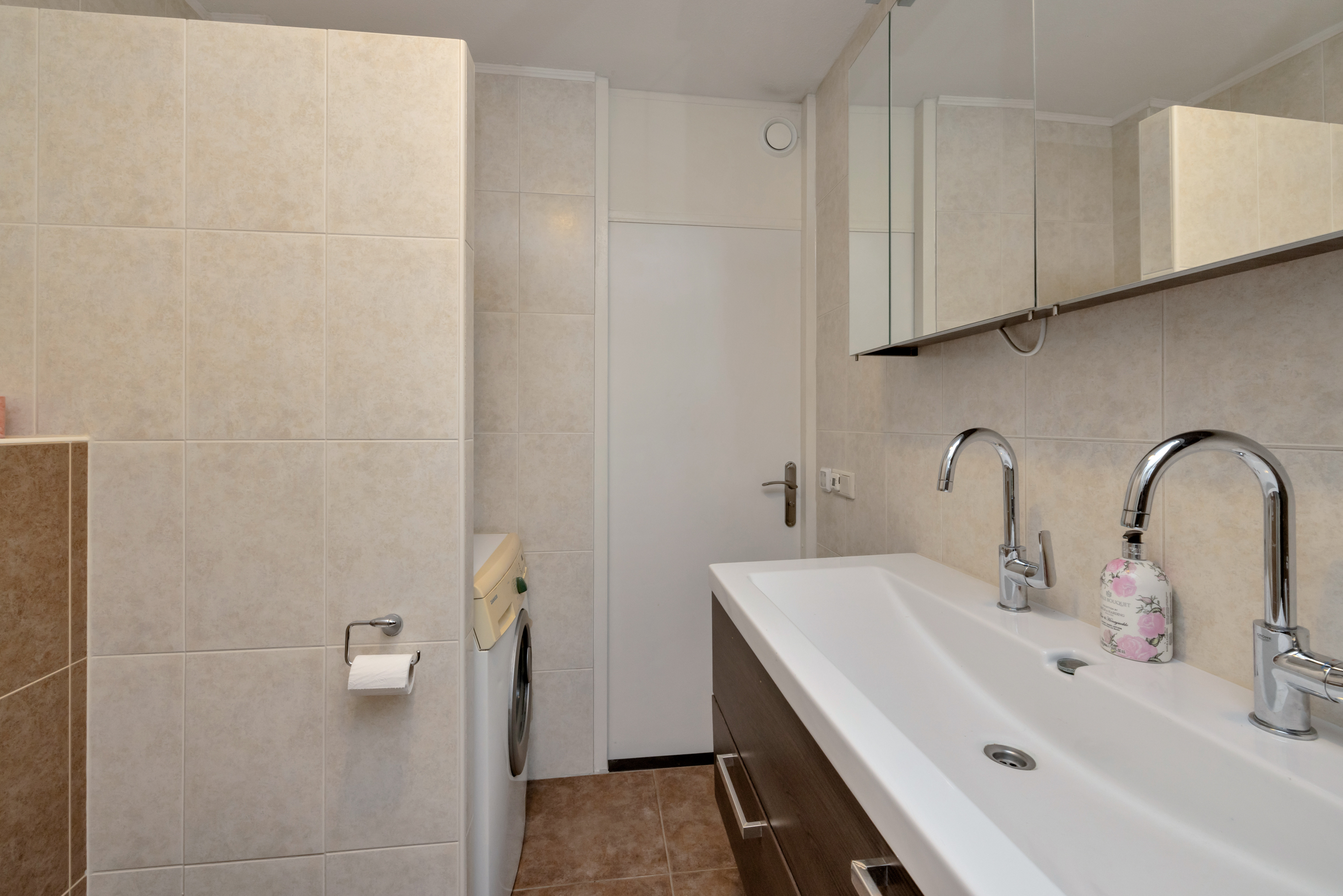 De badkamer is praktisch ingedeeld met een ligbad, douche, wastafel en toiletopstelling. Dankzij de efficiënte indeling is de ruimte comfortabel in gebruik.